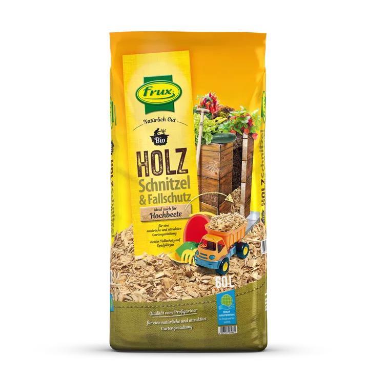 Die frux Bio Holzschnitzel stammen von Nadelbäumen, die in nachhaltiger Forstwirtschaft angebaut werden. Es handelt sich um ein natürliches Produkt, das sich zur Gartengestaltung und Bodenabdeckung, als Fallschutz auf Spielflächen oder als Grundfüllung für Hochbeete eignet.